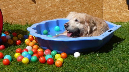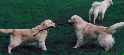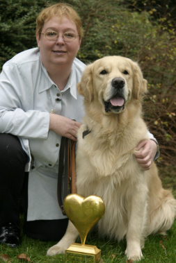 Der 14 Monate alte Golden Rüde hat eine gute Bindung zu seiner Führerin entwickelt, die ihm in allen Testsituationen Sicherheit gibt. Temperament und Bewegungstrieb sind ausgeglichen. Zu fremden Menschen ist er freundlich, aber wenig interessiert, außer die Art der Spielaufforderung sagt ihm zu. Härte, Aufmerksamkeit sowie Beute- und Bringtrieb sind gut erkennbar. Die einengenden Situationen beeindrucken ihn wenig, teilweise genießt er sie. Auf dem Parcour ist er tlw. momentan beeindruckt, insbesondere den Elefanten und das Gespenst verbellt er, läßt sich aber an alles heranführen. Beim 3. Schuß ist er leicht beeindruckt, läuft aber dann zum Schützen. - Ein freundlicher, ausgeglichener Golden-Rüde mit guter Bindung und freundlichem Wesen.