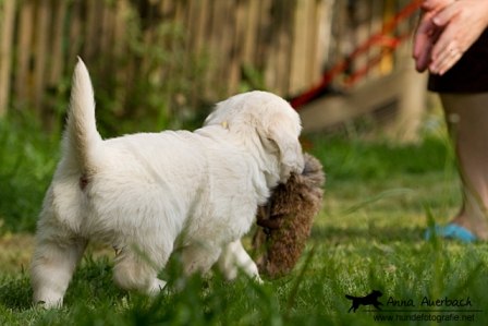 Der Rüde zeigt schönes Beuteverhalten, er trägt gern und ausdauernd zu.