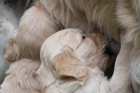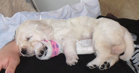 Von der Infusion erlöst, spielte sie wieder mit ihren Geschwistern, mittags durfte sie schon mal kurz an Mama trinken, abends habe ich den Zugang gezogen sie wieder komplett in das Welpenzimmer ziehen lassen.