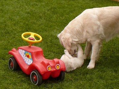 Doch die lütte Hüpfdrossel findet es KLASSE :) und genießt es, wenn Joe sie mit beiden Vorderpfoten festhält,