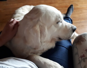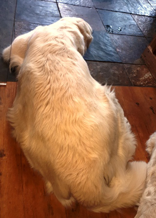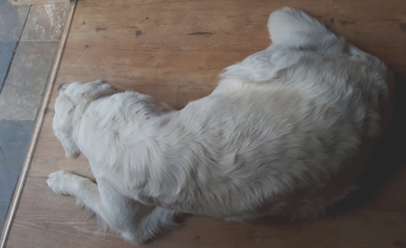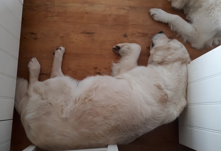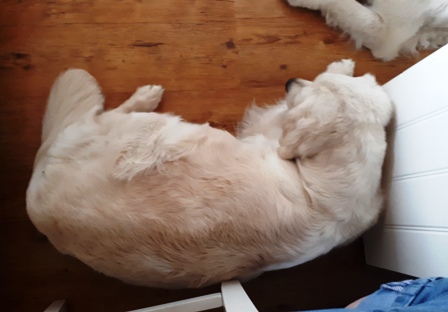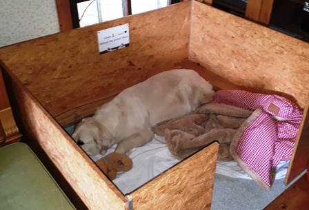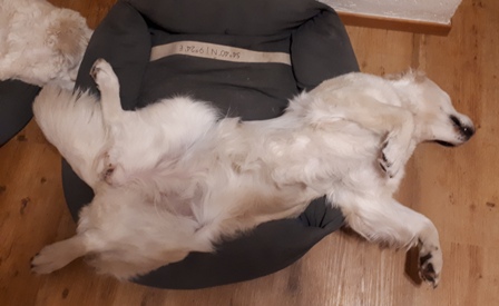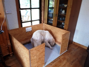 So sitze ich hier im Wohnzimmer und schreibe euch, Phoebe hinter mir in ihrer Kiste..