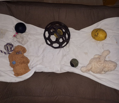 Alles was im Garten und Haus an Spielzeug lag, wurde gesammelt und an die Zitzen gelegt.