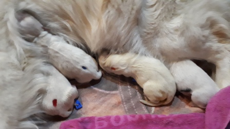 Alle 4 topfit, hingen sofort an Phoebes milchreichen Zitzen!