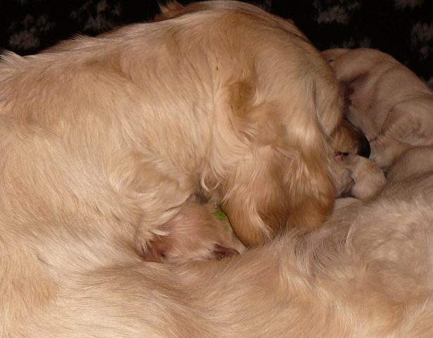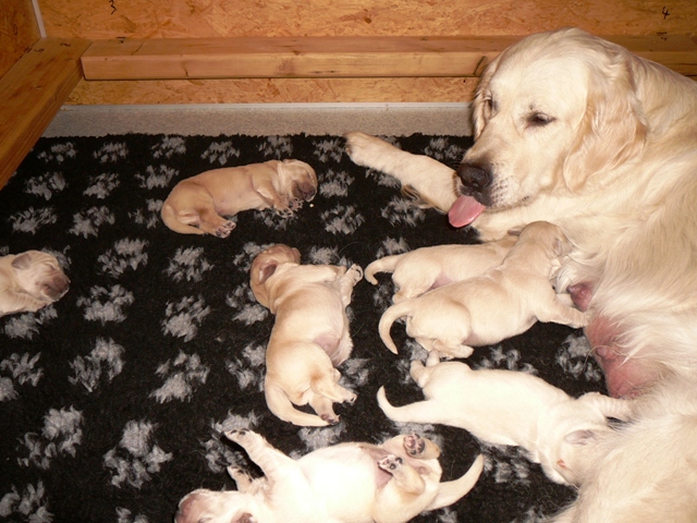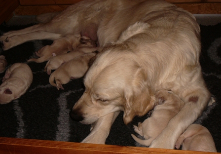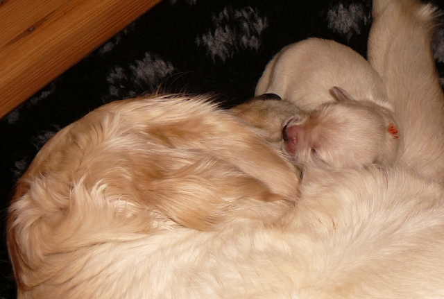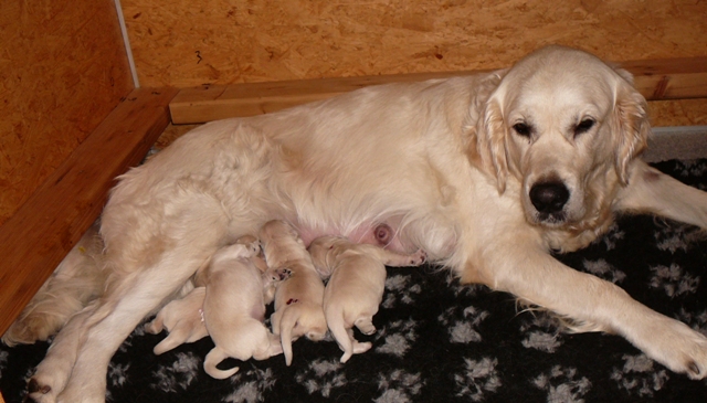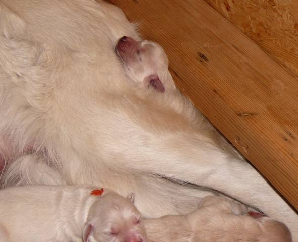 Sie lässt trotzallem die Welpen trinken und versorgt sie nach wie vor mit soo viel Geduld!