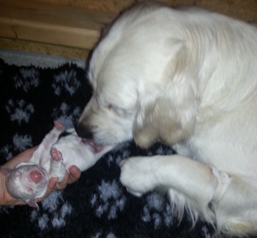 Wir versuchten noch den ersten Welpen mit Unterstützung auf die Welt zu bekommen,